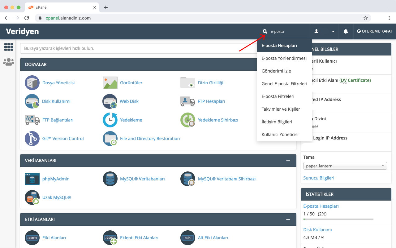 İpucu: Alan adınızın sonuna /cpanel yazarsanız veya :2082 yazarsanız sizi giriş yapacağınız adrese yönlendirecektir. Örneğin; keyturk.info/cpanel veya keyturk.info:2082